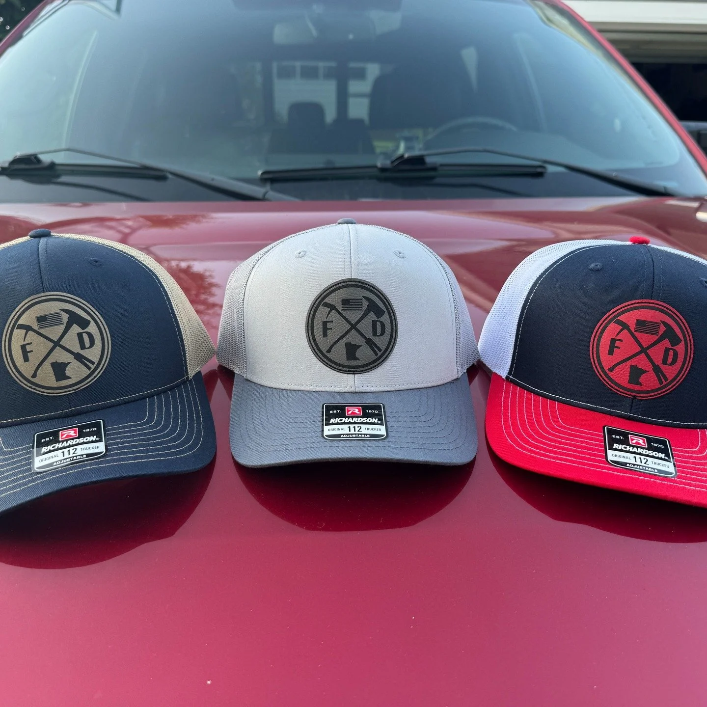 Five baseball caps with circular logos, firefighter cap, first in last out, Richardson brand, mesh back